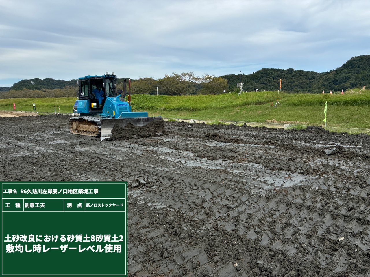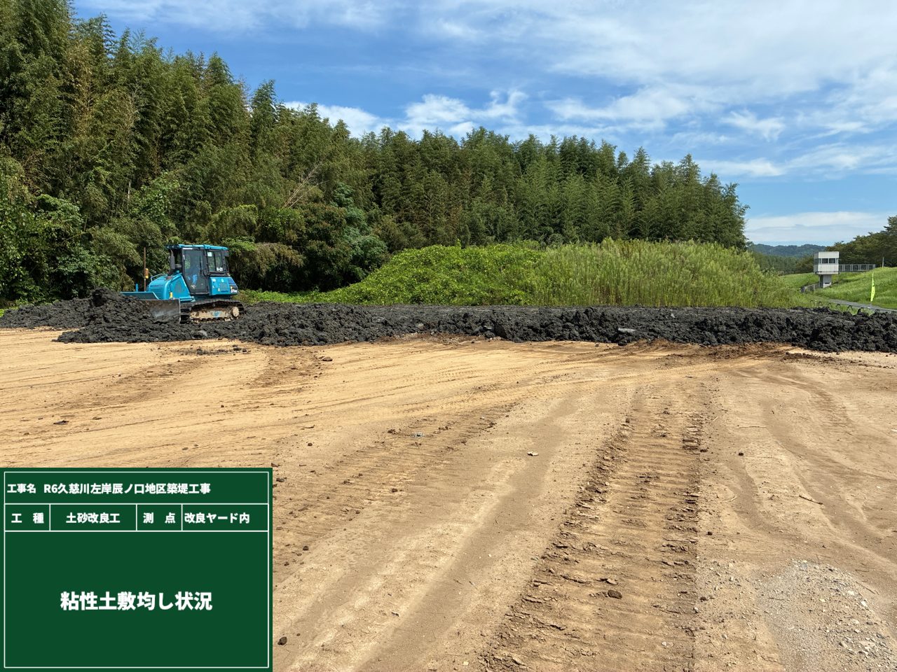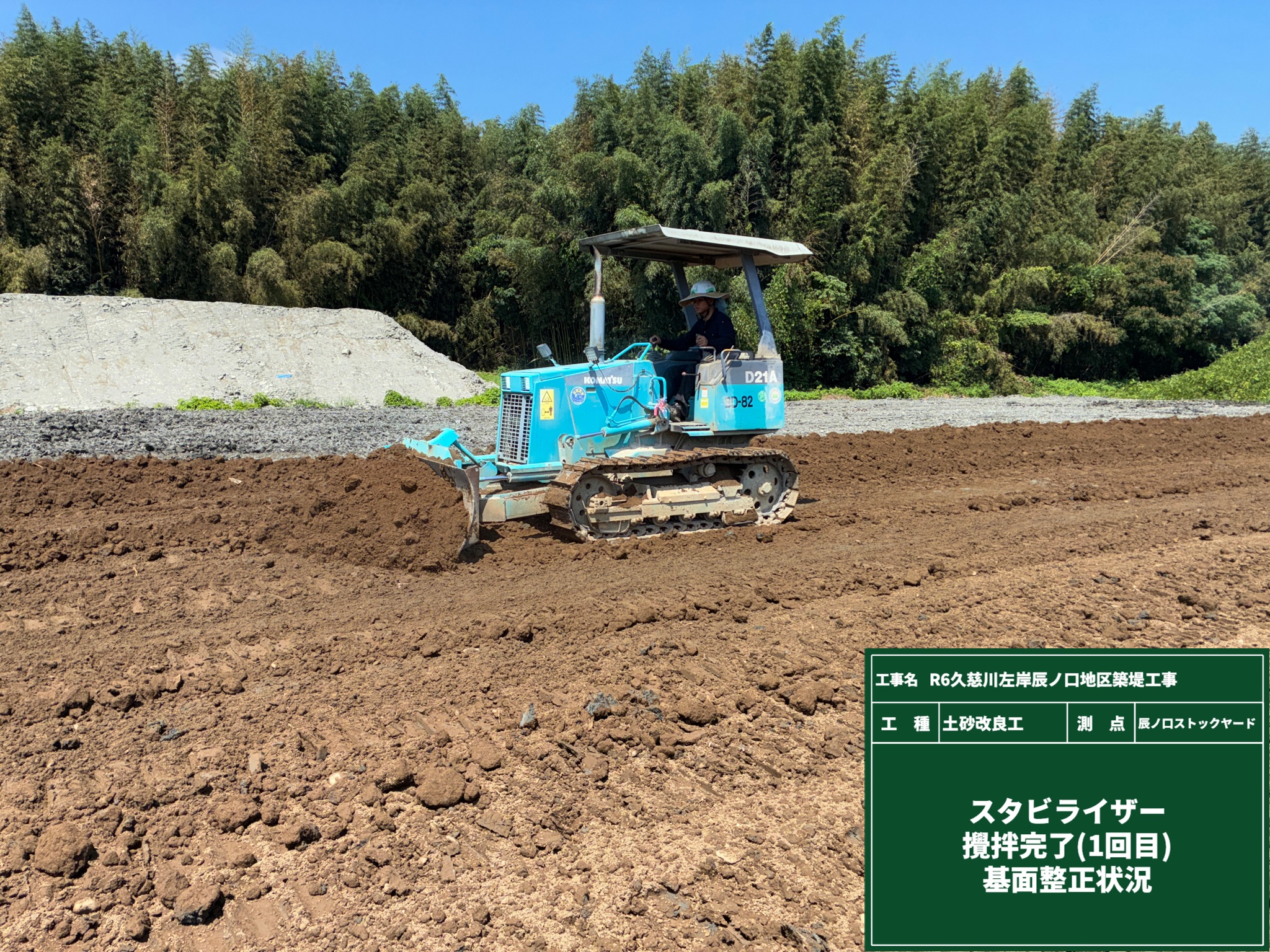 1回攪拌したあとブルドーザーで整地し、もう一度攪拌。これを繰り返して、均一な改良土をつくっていきます。